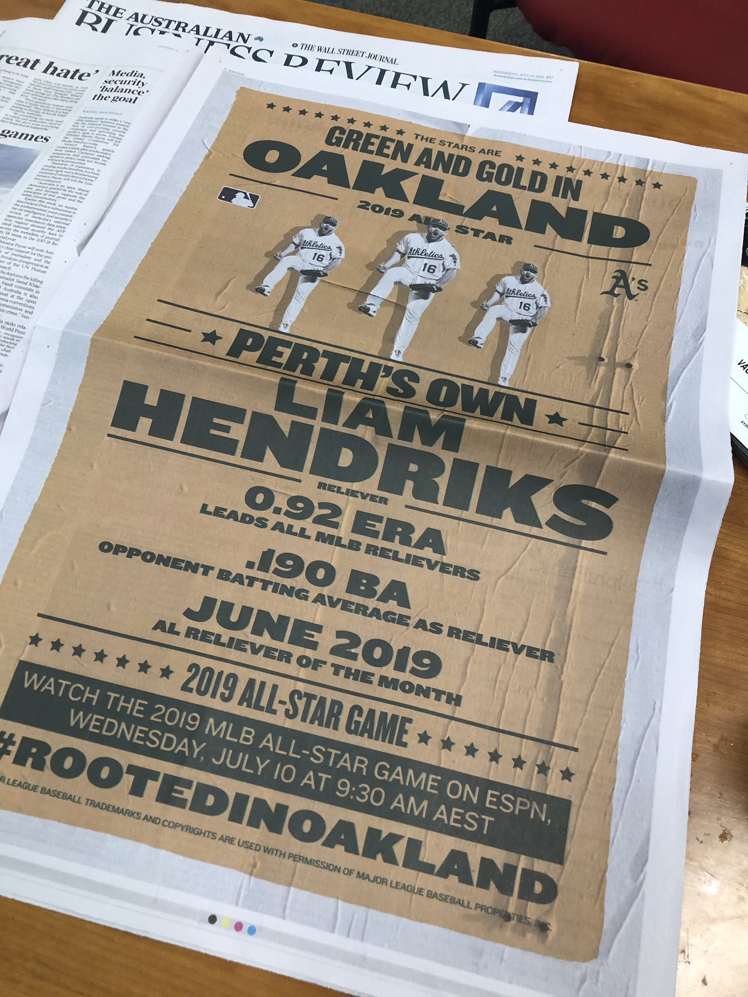 How about the @Athletics taking out a full page ad in The @australian newspaper today to celebrate Aussie all-star pitcher Liam Hendriks pic.twitter.com/XigmvMFHiI